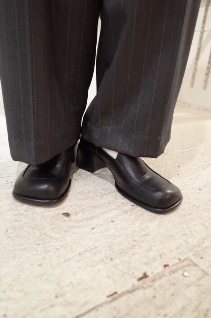 穏やかな曲線のオブリークトゥと程よい高さのあるヒールがモードな印象のローファーです