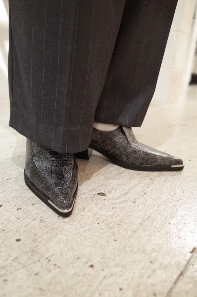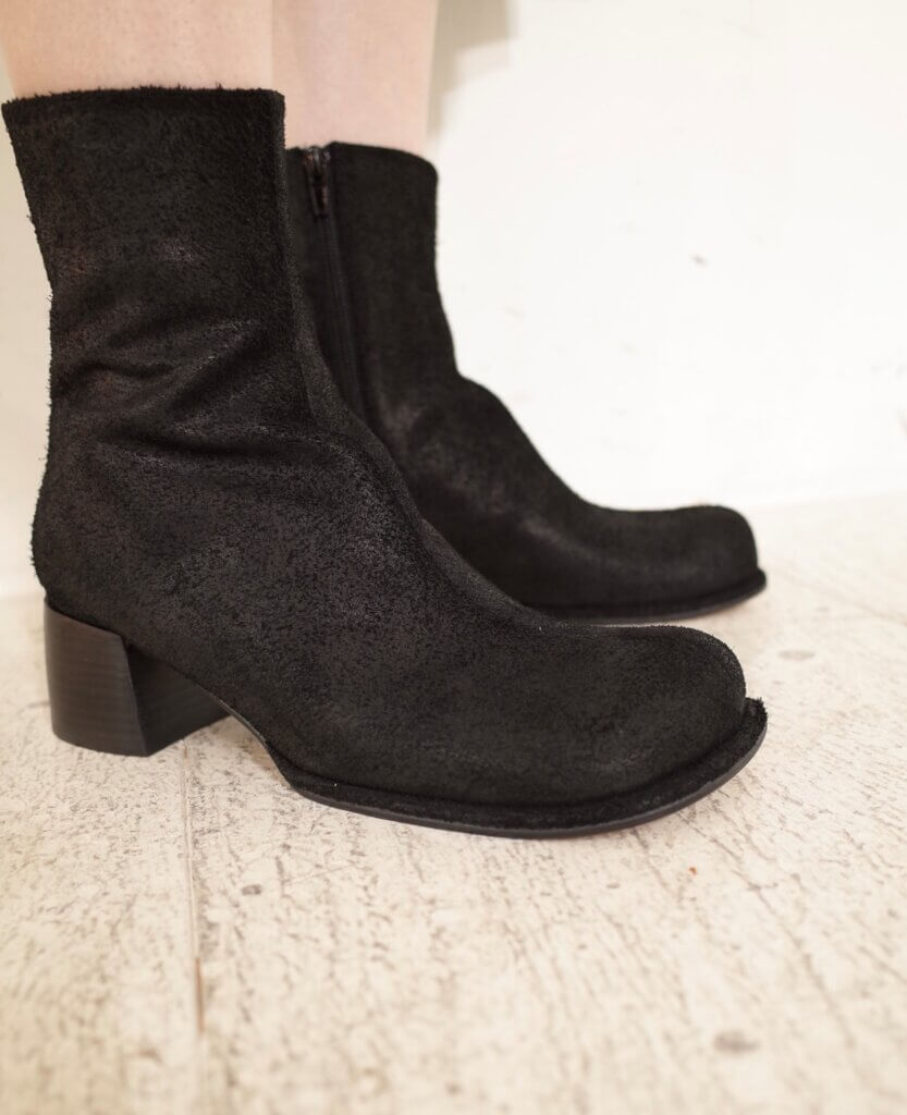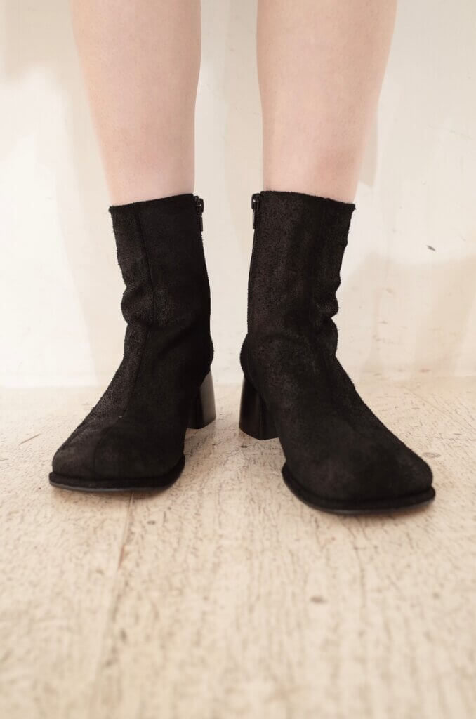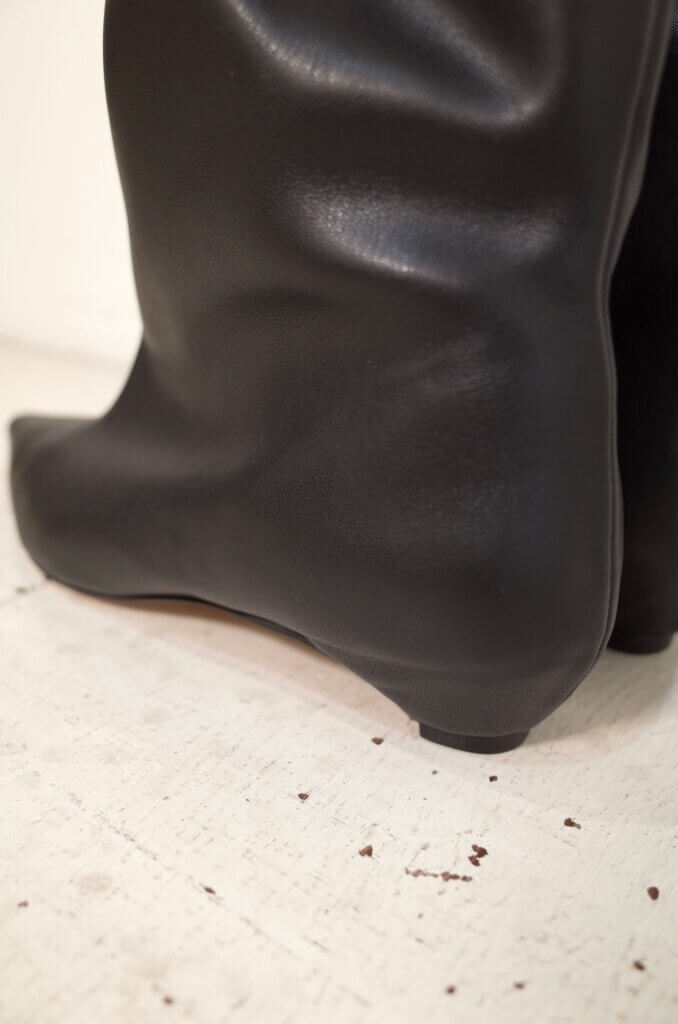 履き口にギャザーを寄せたバルーンシルエットと、シャープなトゥのバランスが新鮮なショートブーツです