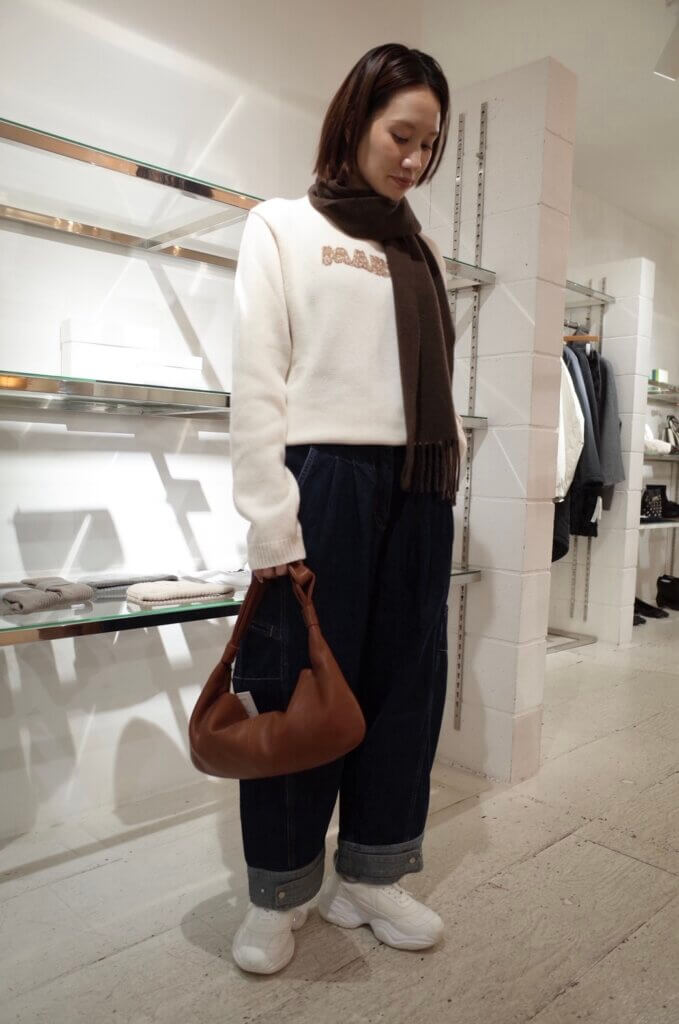 ニットはわりとコンパクトなサイズ感なので、デニムはちょっと男の子っぽいワークウェアのシルエットパンツを合わせました