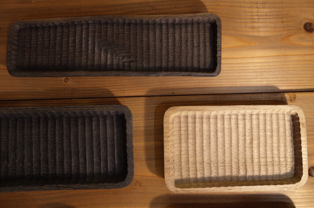江戸時代初期以来、生活の道具として製作されてきた我谷盆は、クリの丸太を薄く割り、丸ノミや平ノミなどのごくわずかな道具で彫った素朴なお盆です。